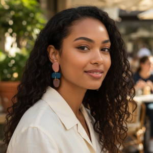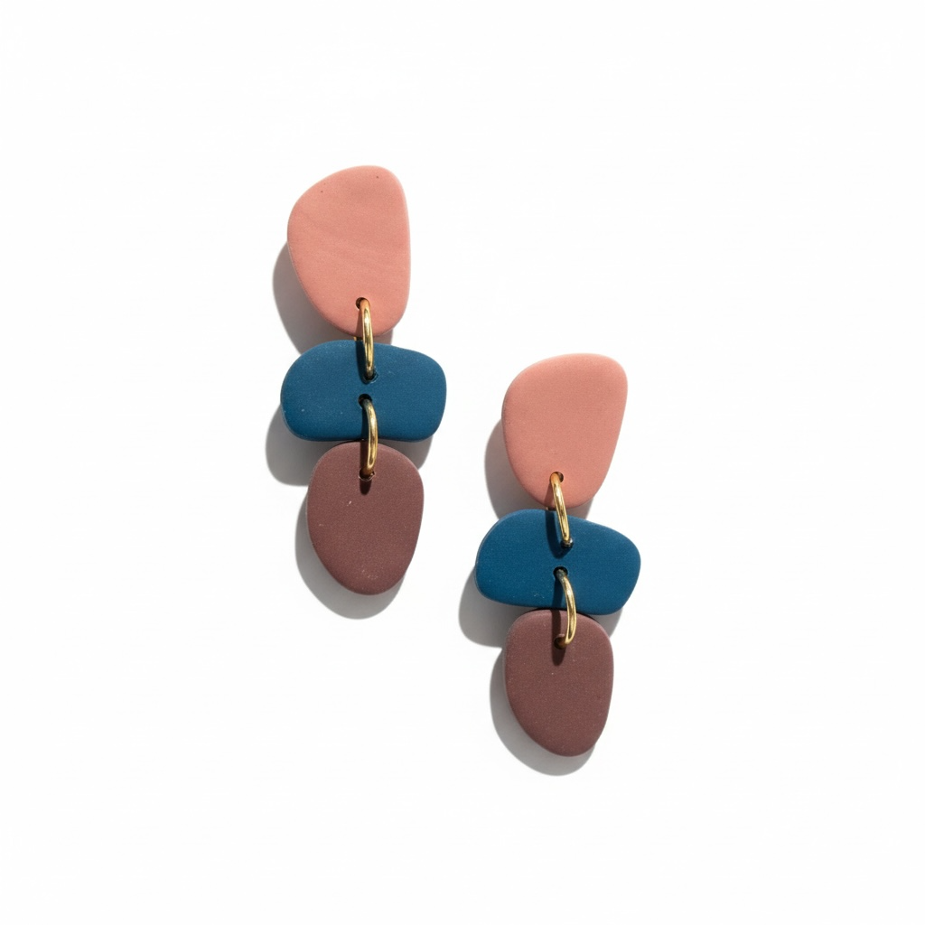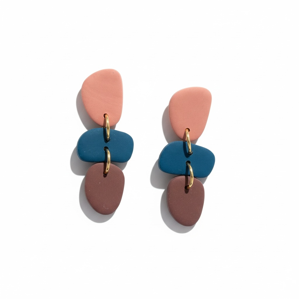 Χειροποίητα κρεμαστά μακριά σκουλαρίκια φτιαγμένα από πολυμερικό πηλό σε συνδυασμό 3 χρωμάτων (σομόν, πετρόλ και καφέ) σε μοντέρνο μίνιμαλ design.