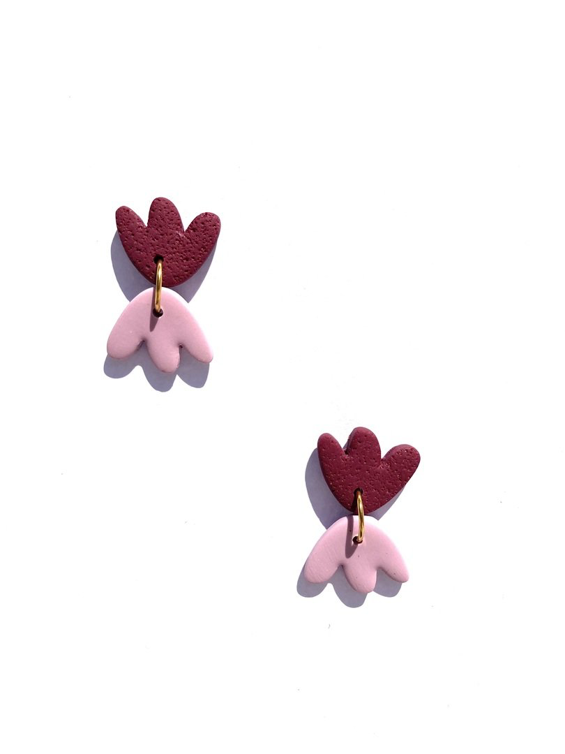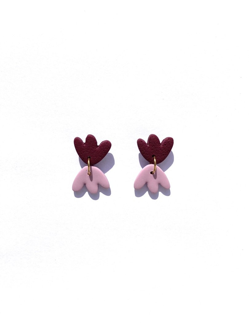 Χειροποίητα κρεμαστά σκουλαρίκια φτιαγμένα από πολυμερικό πηλό σε ξεχωριστό design με σχήμα άνθους, σε μπορντό με απαλό