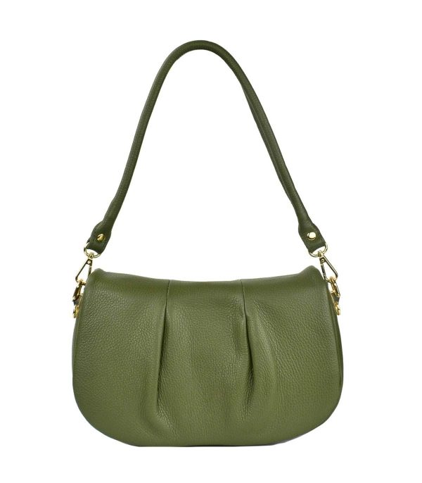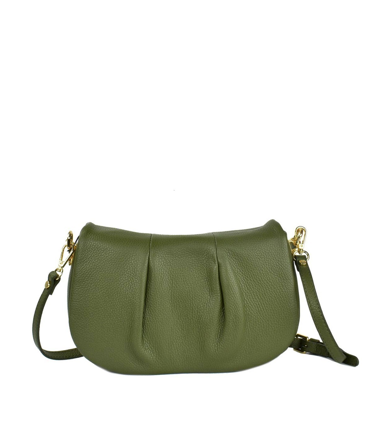 Αυτή είναι μια κομψή δερμάτινη τσάντα μεσαίου μεγέθους με μαλακό δέρμα σε ανάγλυφη υφή. Η τσάντα έχει απαλά στρογγυλεμένο σχήμα με πιέτες στο μπροστινό μέρος, που προσθέτουν μια πινελιά κομψότητας. Περιλαμβάνει ένα κοντό λουράκι για μεταφορά στον ώμο, ενώ διαθέτει και ρυθμιζόμενο δερμάτινο λουράκι χιαστί, καθιστώντας την ιδανική για ελευθερία κινήσεων. Ο συμπαγής αλλά ευρύχωρος σχεδιασμός της την καθιστά κατάλληλη για καθημερινή χρήση, προσθέτοντας παράλληλα μια ζωντανή πινελιά στο ντύσιμό σας.