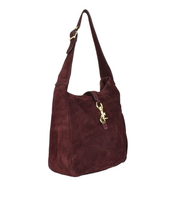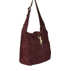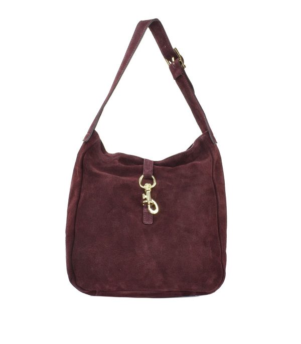 Αυτή η κομψή τσάντα ώμου είναι κατασκευασμένη από γνήσιο δέρμα σουέτ, προσφέροντας διακριτική πολυτέλεια και διαχρονικό χαρακτήρα. Η μπορντό απόχρωση αναδεικνύεται από το χρυσό μεταλλικό κούμπωμα στο μπροστινό μέρος, που λειτουργεί ως λειτουργική αλλά και αισθητική λεπτομέρεια. Το φαρδύ, ρυθμιζόμενο λουράκι εξασφαλίζει άνετη εφαρμογή, ενώ ο ευρύχωρος εσωτερικός χώρος χωρά με άνεση όλα τα καθημερινά σας απαραίτητα.