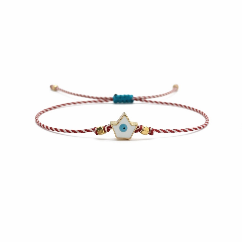 Χειροποίητο βραχιόλι για τον Μάρτη με μεταλλικό στοιχείο καραβάκι με ματάκι επιχρυσωμένο με 24Κ χρυσό και λευκό σμάλτο